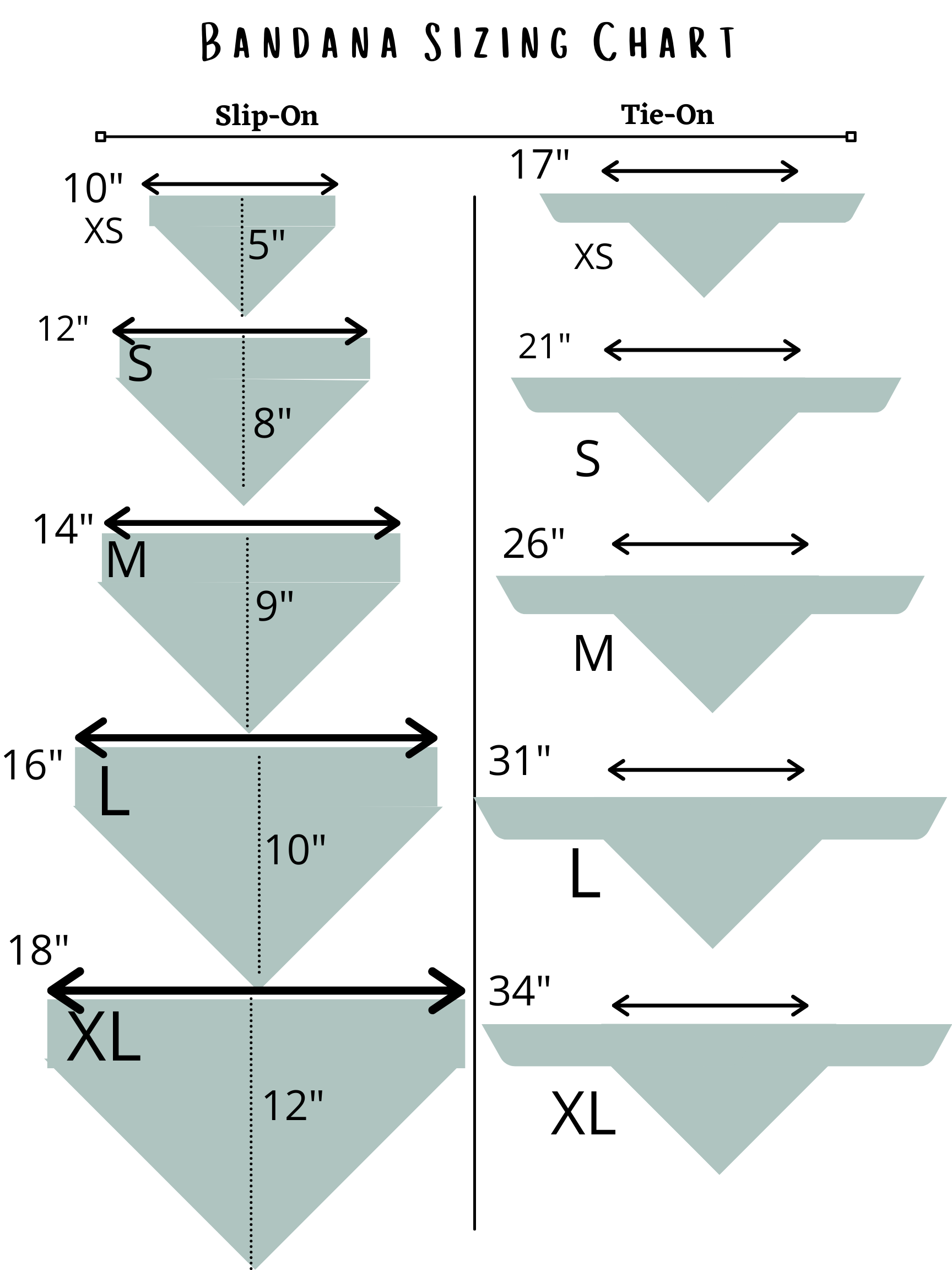 Select tie-on bandanas have a patterned front side and a coordinating solid-colored back side or the same pattern back side. Refer to the size guide attached to determine the appropriate sizing for your pet.